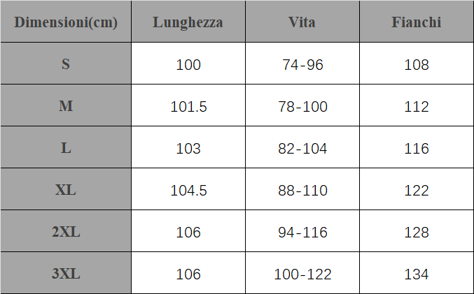 • Dimensione: S, M, L, XL, 2XL, 3XL